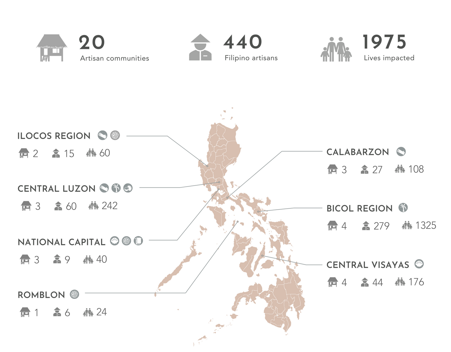 Our artisans come from the regions of Bulacan, Bicol, Romblon, Pangasinan, Nueva Ecija, Paranaque, Taguig, Cebu, all rural or suburban regions close to big cities. This presents unique opportunities for them; they benefit from rich natural resource, and at the same time have access to an urban marketplace. They are, however, also more exposed to the gaping income and wealth disparities the Philippines faces.