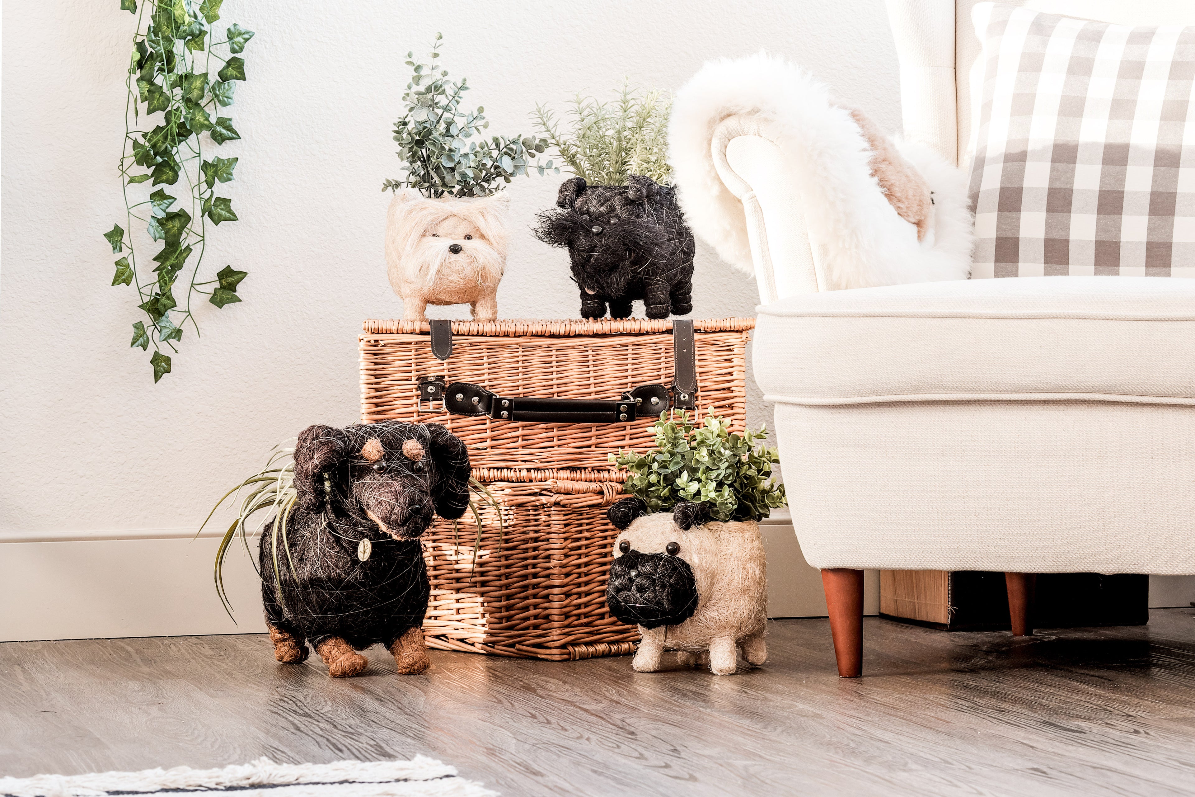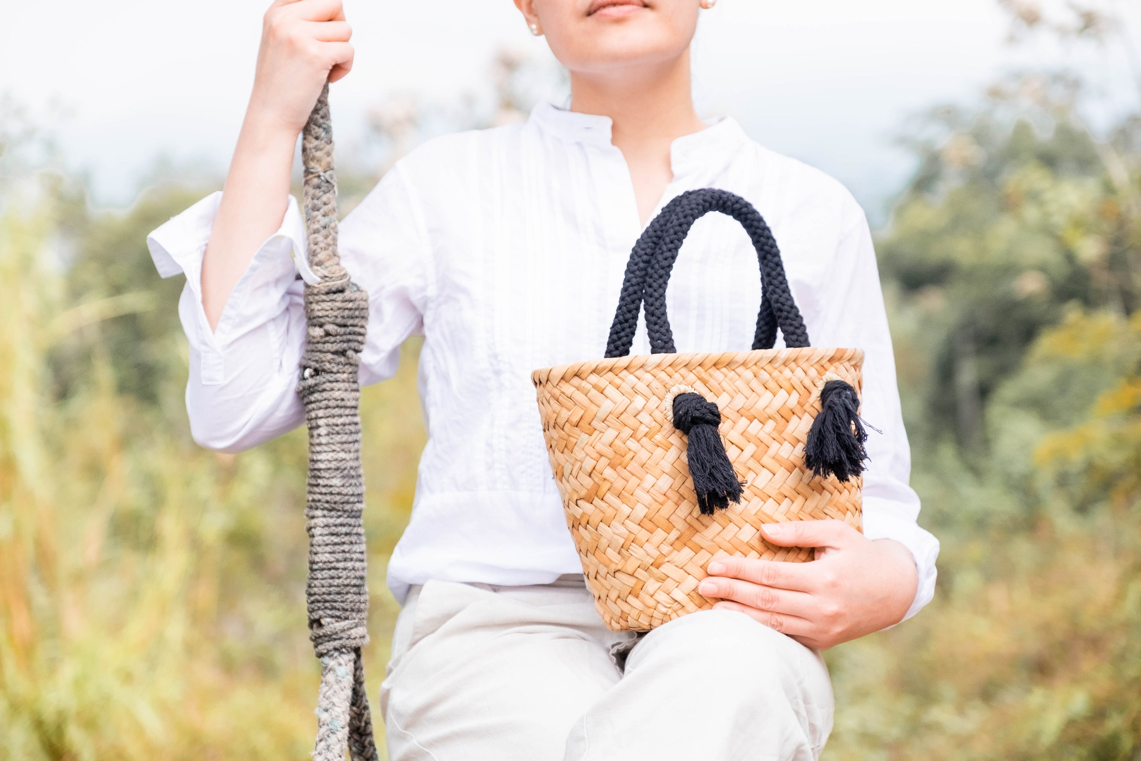 Crafted from natural, eco-friendly materials including natural straw and plant fiber, coco coir, sustainably-sourced shells, and recycled wood.